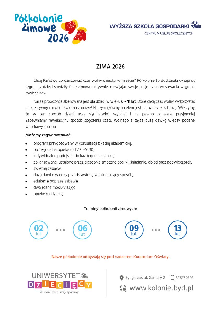Informujemy, iż istnieje możliwość zapisania dziecka na półkolonie zimowe 2026.